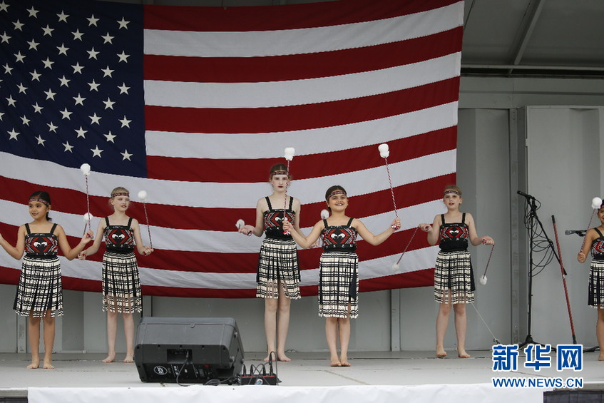 5月19日,来自少数族裔社区的儿童在第28届美国斯科基国际文化节上表演波利尼西亚风格的舞蹈。 新华网记者汪平 摄