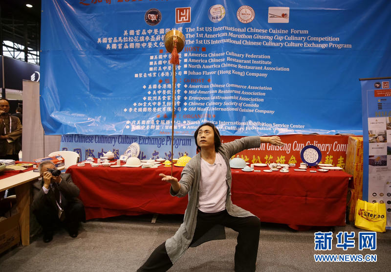 5月19日,在美国芝加哥,民间艺人在中国展区进行长嘴壶茶艺表演。 新华网记者 汪平摄
