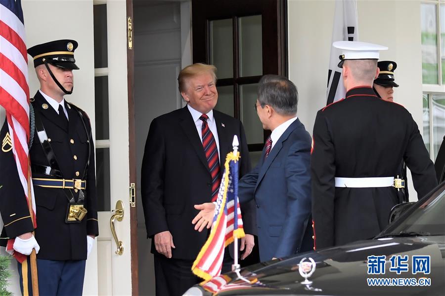 5月22日,美国总统特朗普(左二)在华盛顿白宫欢迎到访的韩国总统文在寅(左三)。 新华社记者杨承霖摄