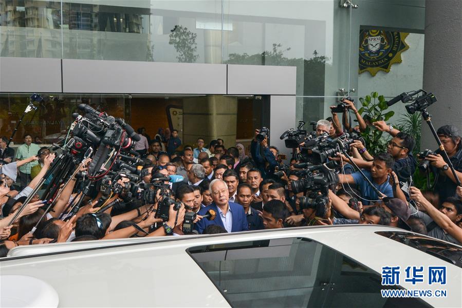 5月22日,马来西亚前总理纳吉布(中)在位于普特拉贾亚的马反腐败委员会接受调查问话后离开。马来西亚前总理纳吉布22日到位于普特拉贾亚的马反腐败委员会接受关于“一个马来西亚发展公司”的调查问话。反腐败委员会负责人穆赫德·舒克里·阿卜杜勒当天召开新闻发布会说,纳吉布到此是就个人银行账户中一笔高达4200万林吉特(约1060万美元)的存款做出说明,这笔存款据信来自“一个马来西亚发展公司”前子公司SRC国际。新华社发(张纹综摄)