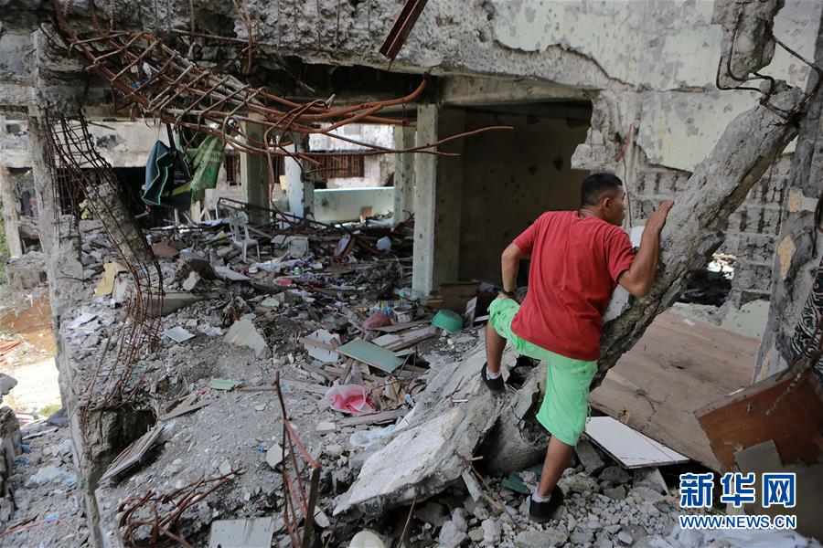 5月22日,在菲律宾马拉维,一名男子在一栋建筑的废墟内查看。菲律宾政府官员21日表示,菲南部城市马拉维的重建工作即将开始并预计在2021年前完成。2017年,菲政府军与反政府武装“穆特组织”及阿布沙耶夫武装人员在马拉维发生交火,战事持续5个月,导致城市损毁严重。新华社发 乌玛利 摄