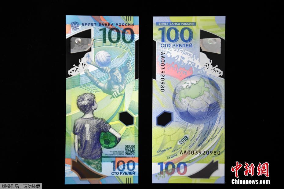 当地时间5月22日,俄罗斯发行面值100卢布的世界杯纪念钞票,这种新型纪念钞完全由塑料制成,比一般纸币具有更多的防伪功能以及耐脏耐潮属性。