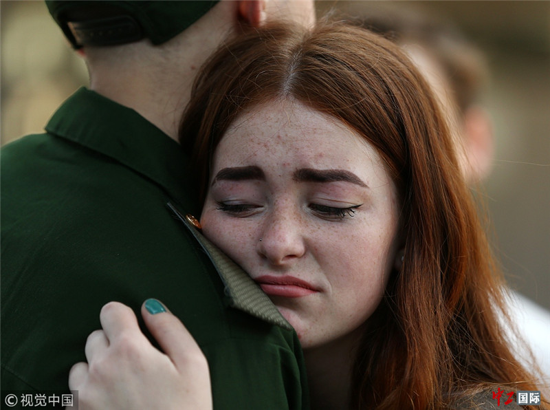 当地时间2018年5月23日,俄罗斯塞瓦斯托波尔,俄2018年春季应征入伍的新兵准备前往俄罗斯航空航天部队服役,与亲友告别。