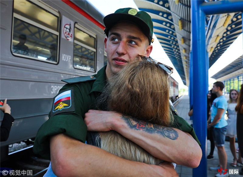 俄2018年春季应征入伍新兵赴部队 告别亲友依依不舍