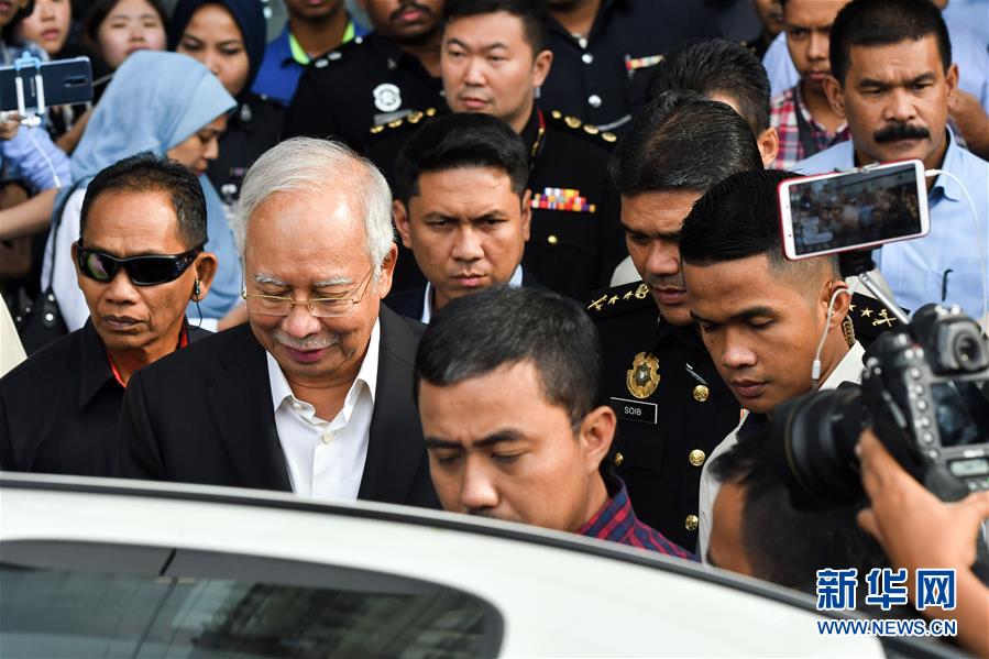 5月24日,在马来西亚普特拉贾亚,马来西亚前总理纳吉布(前左二)接受问话后离开反腐败委员会。新华社发(张纹综摄)