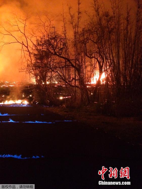 夏威夷火山喷发现奇景 甲烷燃烧冒蓝色火焰