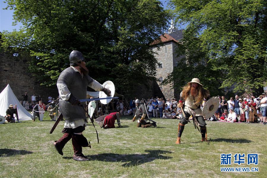 5月26日,在挪威首都奥斯陆阿克什胡斯堡,演员在表演中世纪战斗场面。一年一度的奥斯陆中世纪节于5月25日至27日举行,通过表演和实物场景再现等形式向参观者展示奥斯陆中世纪时期人们的生活场景。新华社记者梁有昶摄