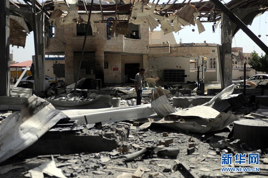 5月27日,在也门首都萨那,一名男子检查遭袭的加油站。