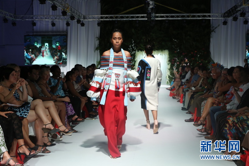 斐济时装周上,身着苗族服饰元素服装的模特们在走秀。新华网记者 张永兴摄
