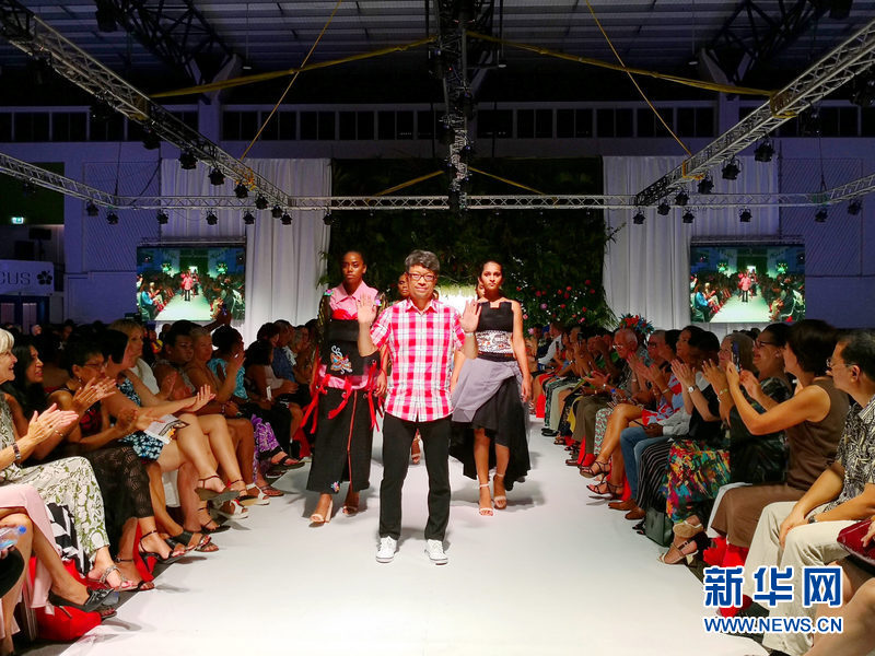 斐济时装周上,陈彬教授率领模特向观众致谢。新华网记者 张永兴摄