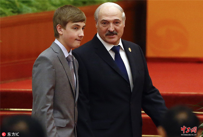 2017年5月14日,中国北京,“一带一路”国际合作高峰论坛在京举行。 北京人民大会堂,各国元首的欢迎宴会上,美食精致吸睛。图为白俄罗斯总统亚历山大·卢卡申科和他的儿子。