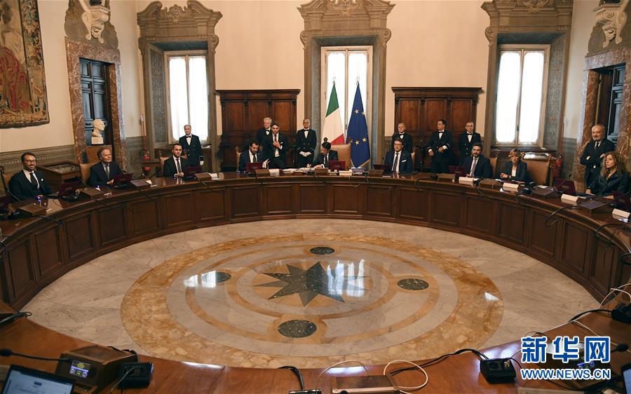 6月1日,在意大利罗马,新政府总理孔特(中)主持第一次内阁会议。新华社发(阿尔贝托·林格里亚 摄)