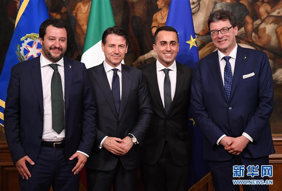 6月1日,在意大利罗马,新政府总理孔特(左二)同副总理兼经济发展与劳工部长迪马约(右二)、副总理兼内政部长萨尔维尼(左一)合影。 新华社发(阿尔贝托·林格里亚 摄)