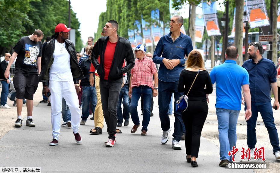 身高均超过2米的几位男士走在巴黎街头,周围行人纷纷侧目。