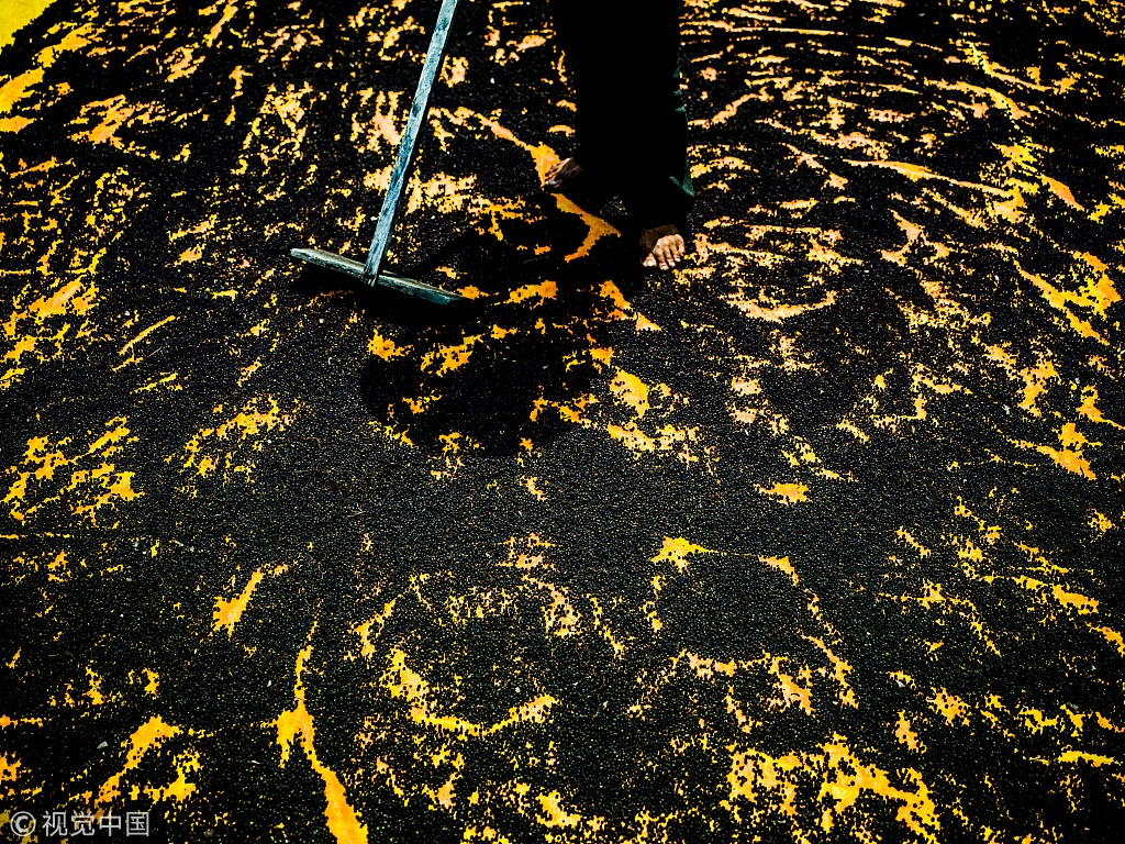 2018年6月5日讯(具体拍摄时间不详),越南富国岛,乍一看这些画面似乎是艺术家在画布上创作,而实际却是一名农民在阳光下晒花椒。专业摄影师Justin Mott使用无人机拍摄到农民晒花椒的鸟瞰图。
