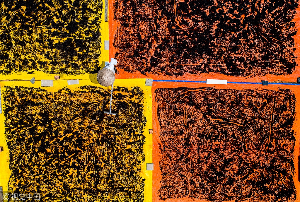 2018年6月5日讯(具体拍摄时间不详),越南富国岛,乍一看这些画面似乎是艺术家在画布上创作,而实际却是一名农民在阳光下晒花椒。专业摄影师Justin Mott使用无人机拍摄到农民晒花椒的鸟瞻图。