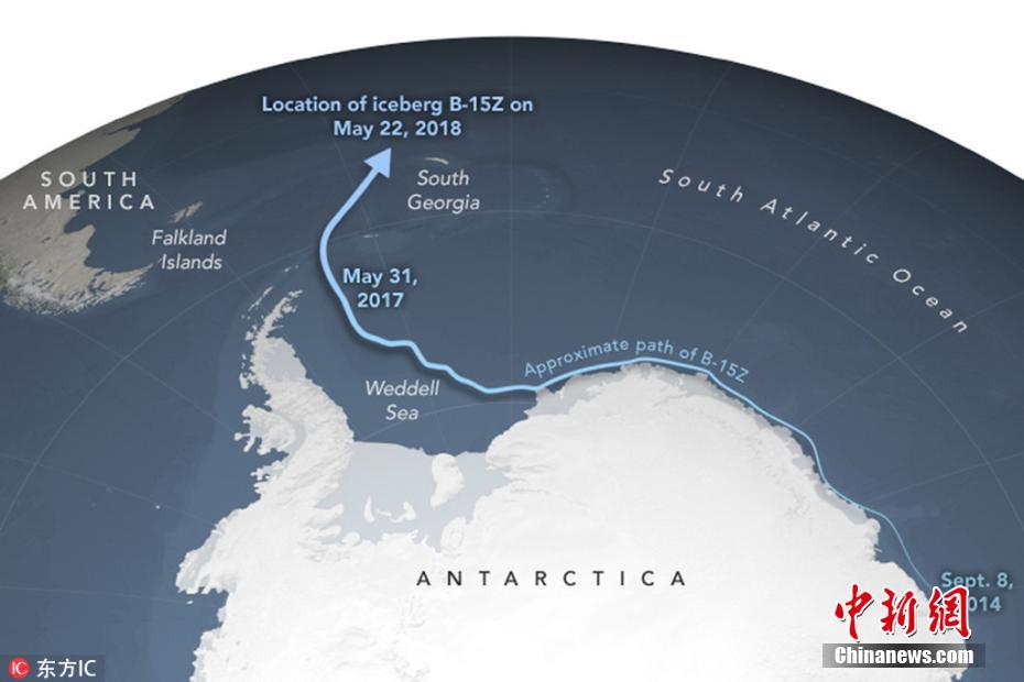 目前,冰山已经漂至大西洋南乔治亚群岛附近的温暖水域。NASA的专家表示:“据了解,能漂移如此远距离的冰山通常会迅速融化并将在那里终结它们的生命周期。” 图片来源:东方IC 版权作品 请勿转载