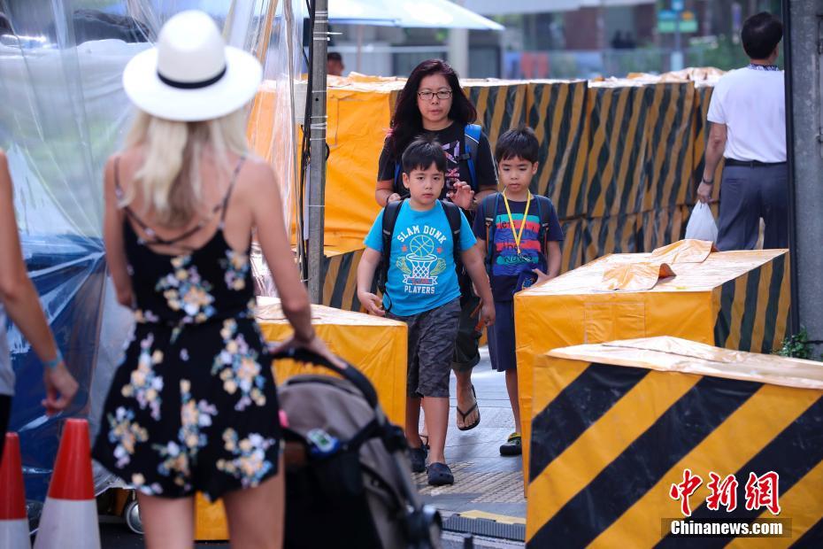 6月11日,朝鲜最高领导人金正恩下榻的新加坡瑞吉酒店外,当地民众路过警方设置的隔离带。中新社记者 刘震 摄