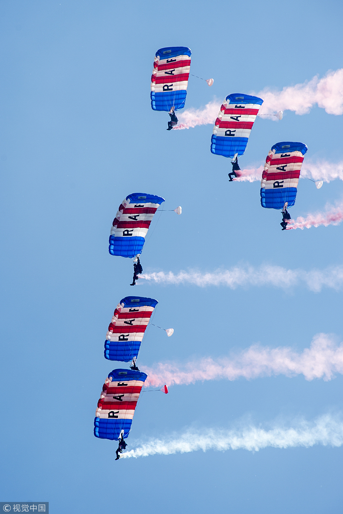 当地时间2018年6月10日,英国伍尔弗汉普顿,2018年皇家空军考斯福德航空展在当地举行,皇家空军特技表演队在当地进行表演。