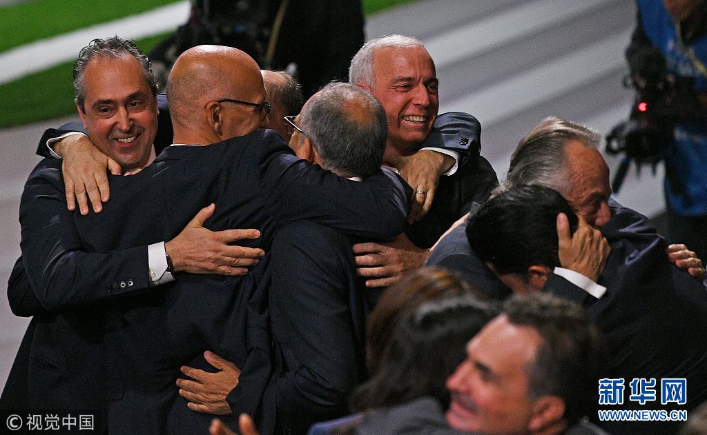 6月13日,俄罗斯莫斯科,加拿大、墨西哥、美国申办代表团成员在宣布结果后庆祝。当日,在俄罗斯莫斯科举行的国际足联第68届大会上,加拿大、墨西哥、美国三国联合申办2026年世界杯足球赛成功。(图片来源:视觉中国)