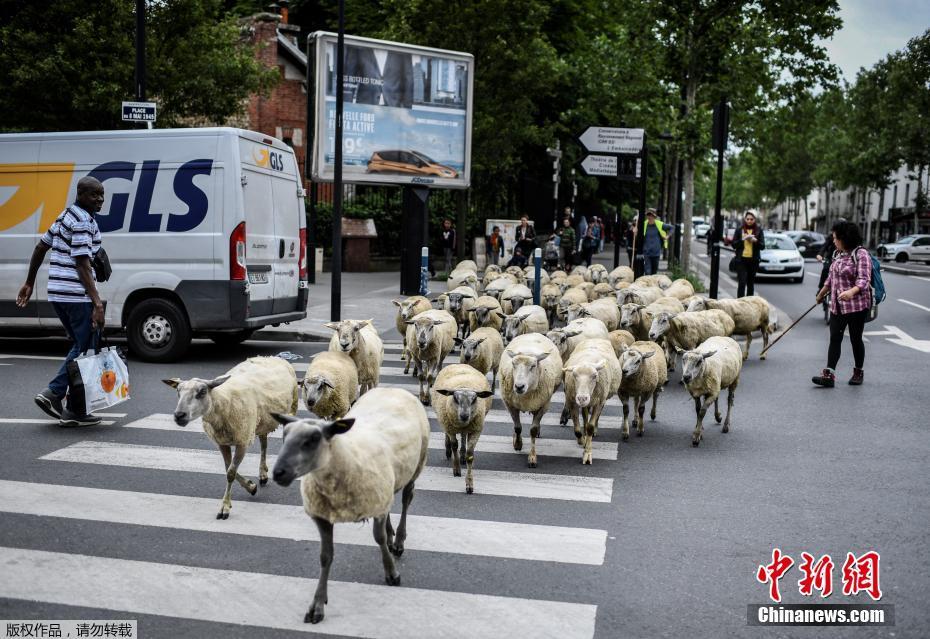 法国农民赶羊进城 横穿斑马线引路人驻足