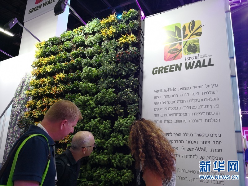 以色列家居建材节展会上,用鲜活的绿色植物设计出的背景墙。新华网记者陈文仙 摄