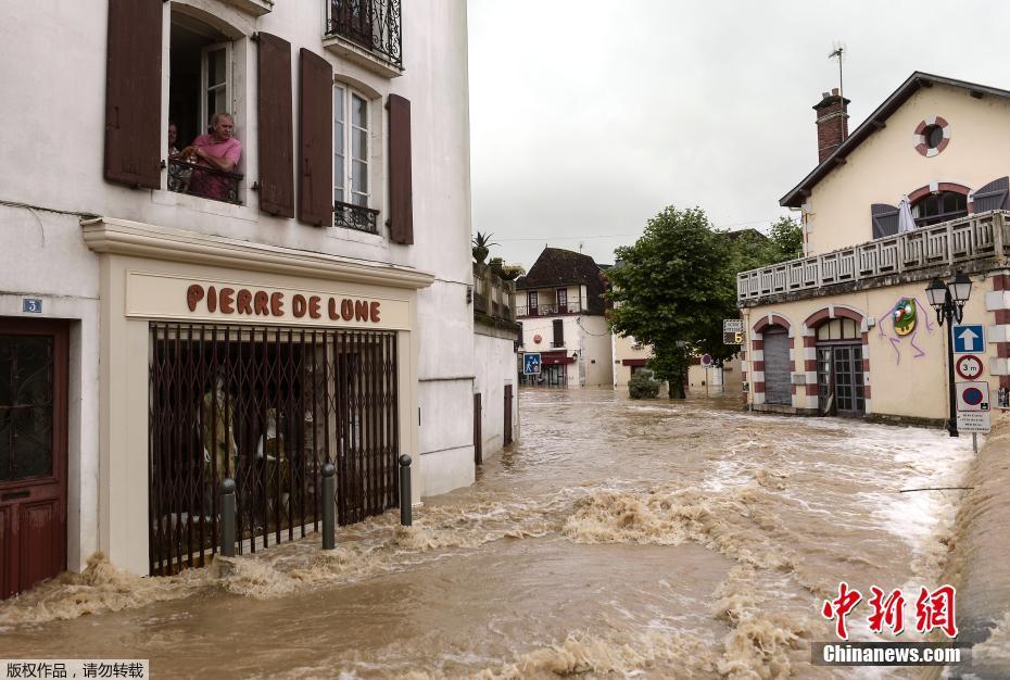 当地时间2018年6月13日,法国Salies-de-Bearn,当地暴雨致街道洪水泛滥,民众上演水上“历险记”。