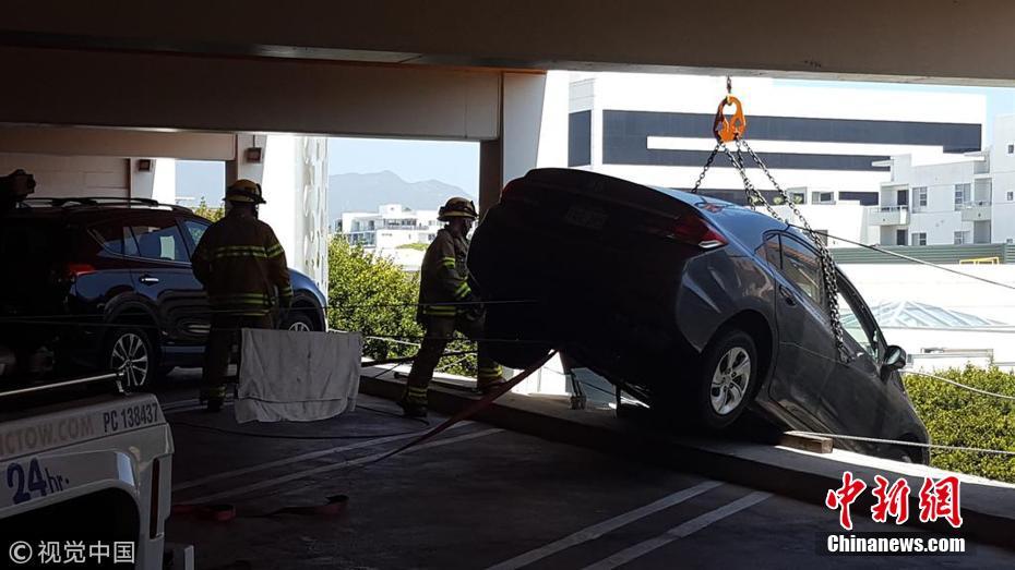 当地时间2018年6月11日,美国加州圣莫妮卡,一名60多岁的女性司机错把油门当刹车,险些将轿车冲出高层停车场的围栏,车子悬在半空情况危急,所幸该女司机被现场民众救出。图片来源:视觉中国