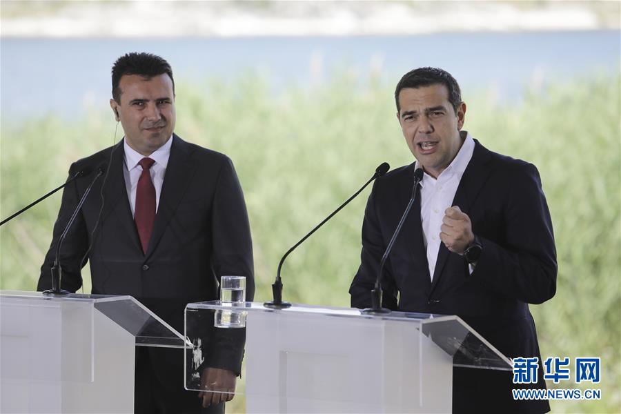 6月17日,在位于希腊边境普雷斯帕湖地区的普萨拉泽斯,希腊总理齐普拉斯(右)与马其顿总理扎埃夫出席当天的签字仪式希腊和马其顿6月17日在两国交界的普雷斯帕湖希腊一侧签署有关马其顿国名更改问题协议,以结束两国在该问题上长达20多年的争议。新华社发(迪米特斯·托斯迪斯 摄)