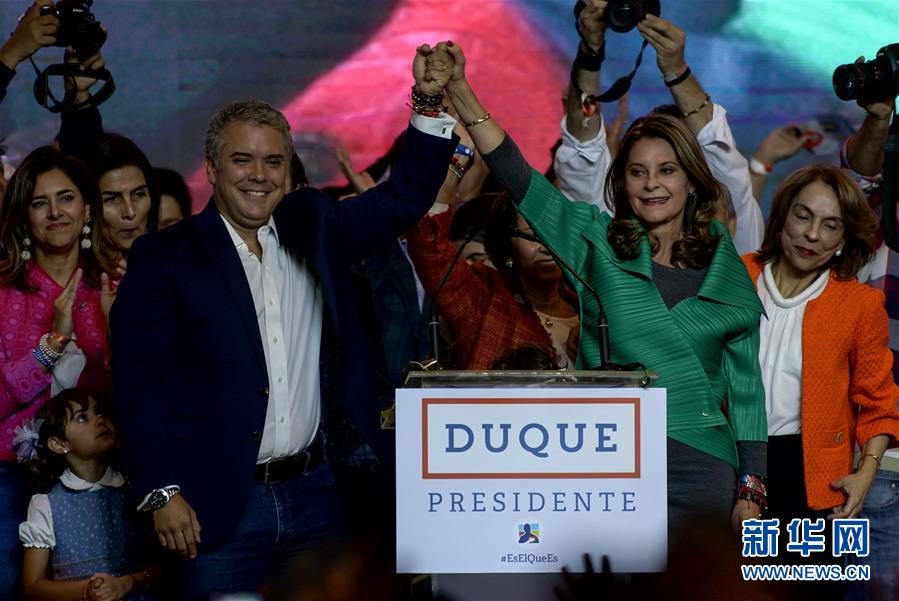 6月17日,在哥伦比亚波哥大,在第二轮总统选举中获胜的杜克(前左)参加庆祝活动。哥伦比亚总统选举第二轮投票17日结束。右翼候选人杜克战胜左翼候选人彼得罗,当选哥伦比亚新一任总统。杜克将于8月7日宣誓就职,任期至2022年。新华社发(霍恩·帕斯摄)
