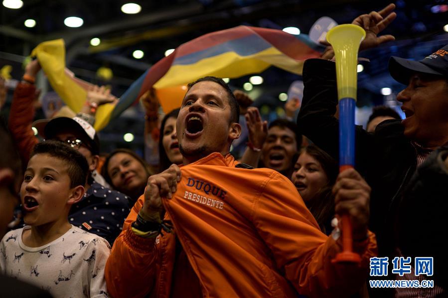 6月17日,在哥伦比亚波哥大,杜克的支持者参加庆祝活动。哥伦比亚总统选举第二轮投票17日结束。右翼候选人杜克战胜左翼候选人彼得罗,当选哥伦比亚新一任总统。杜克将于8月7日宣誓就职,任期至2022年。新华社发(霍恩·帕斯摄)