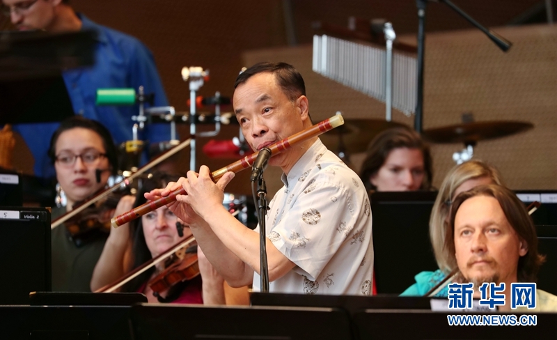6月14日,在芝加哥千禧公园的普利兹克露天音乐厅,华人笛子演奏家梁嘉驹在表演。新华网记者汪平 摄