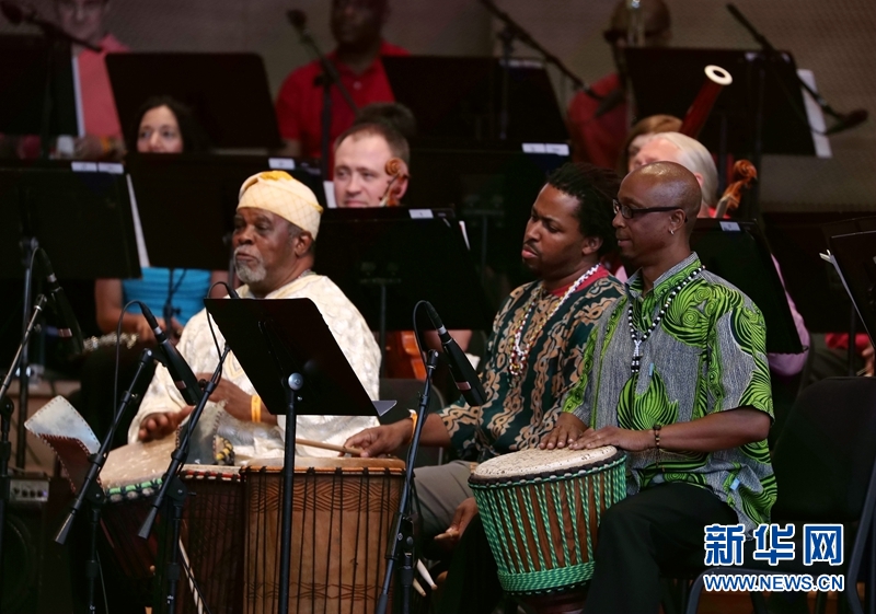 6月14日,在芝加哥千禧公园的普利兹克露天音乐厅,来自非洲社区的音乐家在表演。新华网记者汪平 摄