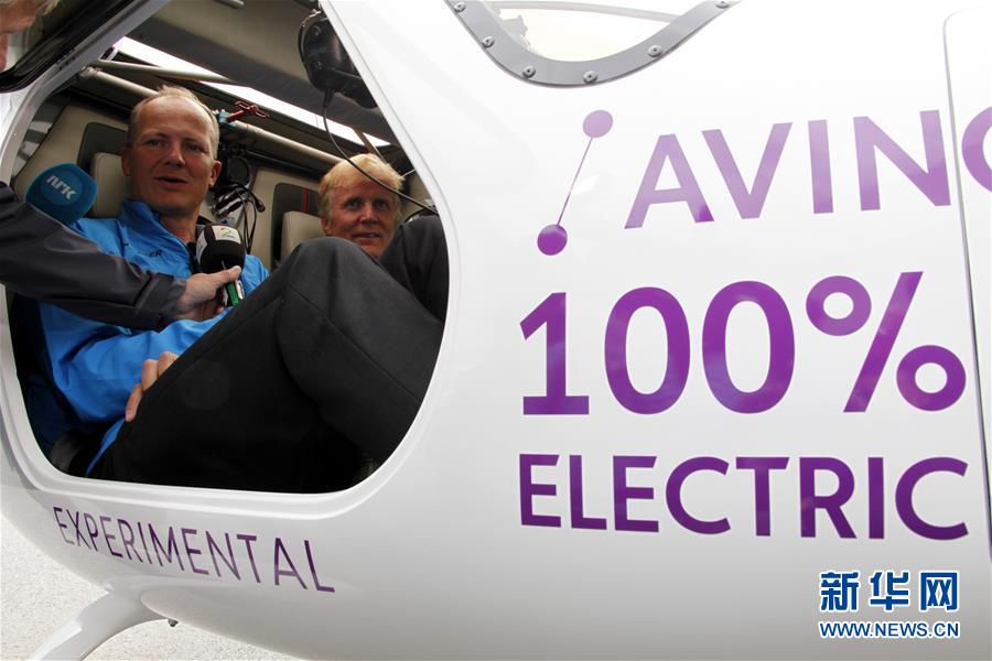 6月18日,在挪威首都奥斯陆加勒穆恩机场,挪威交通和通讯大臣凯蒂尔·苏尔维克-奥尔森(左)和挪威国营机场运营商阿维诺尔公司首席执行官达格·法尔克-彼得森在一架“阿尔法电动G2”双座全电动飞机内接受媒体采访。 新华社记者梁有昶摄