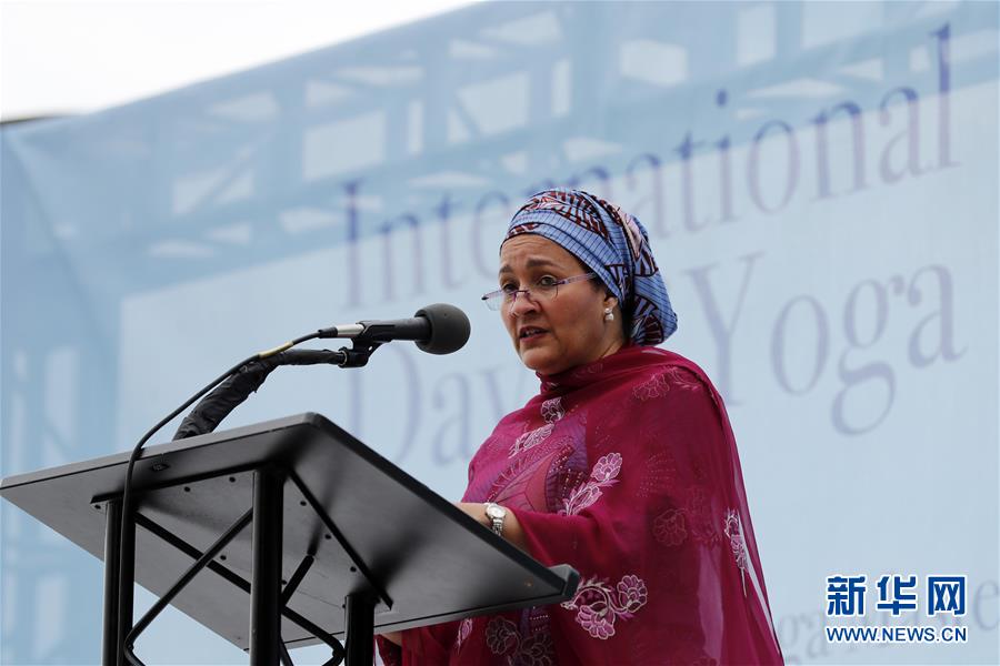 6月20日,在位于纽约的联合国总部,联合国常务副秘书长阿明娜·穆罕默德在“国际瑜伽日”活动上讲话。联合国2014年通过决议,将每年的6月21日定为“国际瑜伽日”。