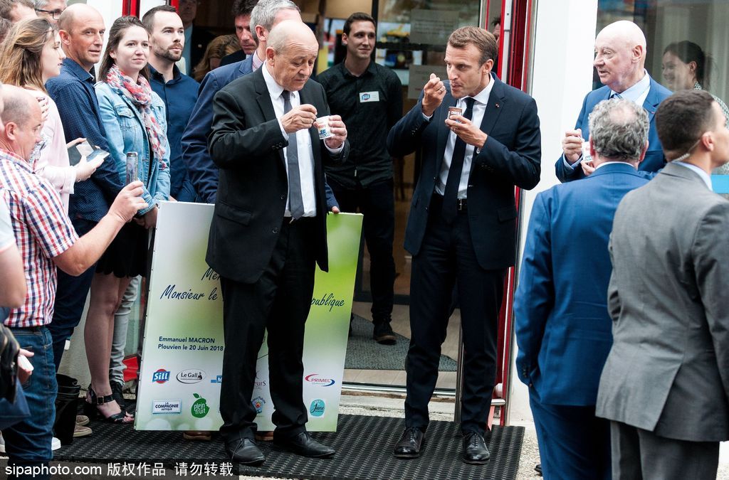 当地时间2018年6月20日,法国普卢维安,法国总统马克龙(Emmanuel Macron)参观了dans le Finistere ,这是一家仍在普卢维安的农业公司。Gilles Falc hun 老板向马克龙总统介绍了他的公司。多年来,该公司一直在创新,每年创造1200个新配方,这要归功于一个由30人组成的研发团队。