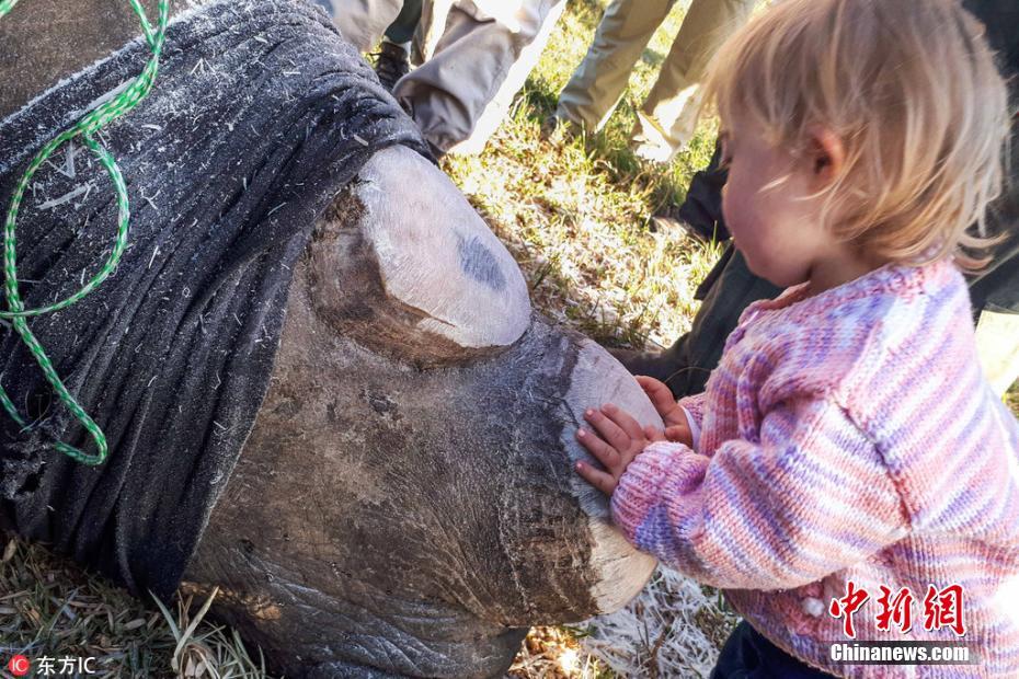 南非犀牛被锯掉牛角 小女孩献吻画面暖化