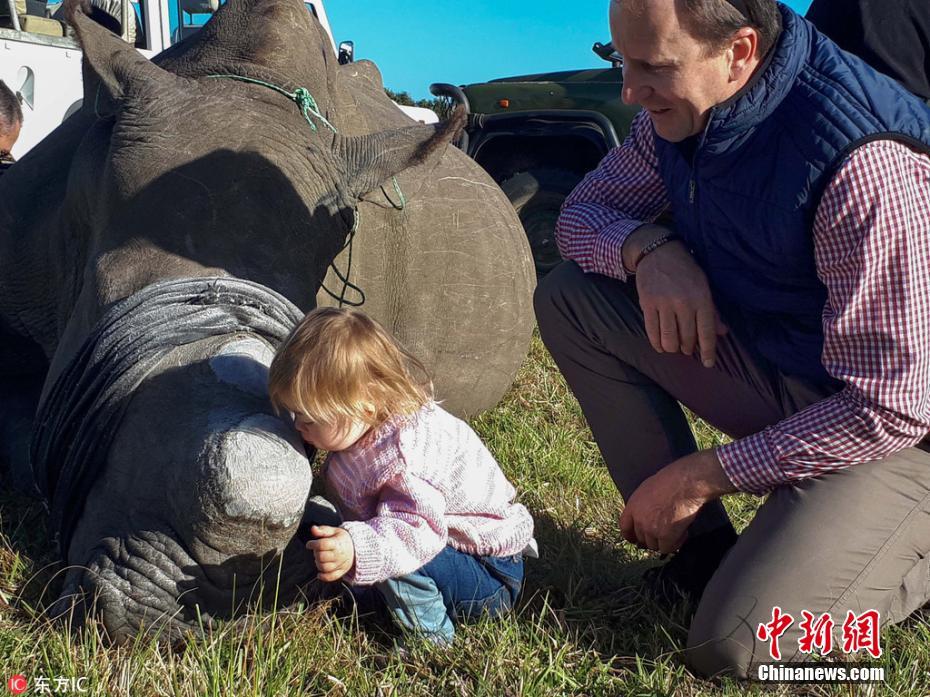 保护区的负责Ayesha Cantor拍摄下,她朋友的3岁女儿Ava在白犀牛Chunk被打了麻醉药剂、锯掉牛角后,轻轻地走上前,温柔地亲吻Chunk,以希望犀牛快点好起来,画面瞬间暖化了。图片来源:东方IC 版权作品 请勿转载