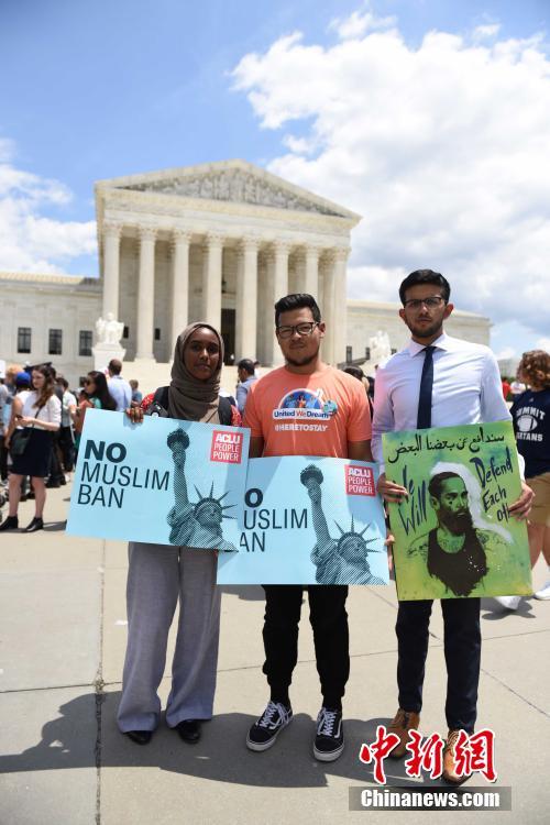 当地时间6月26日,在美国联邦最高法院裁决支持特朗普2017年颁布的移民限制令后,民众在最高法院门口抗议。中新社记者 邓敏 摄