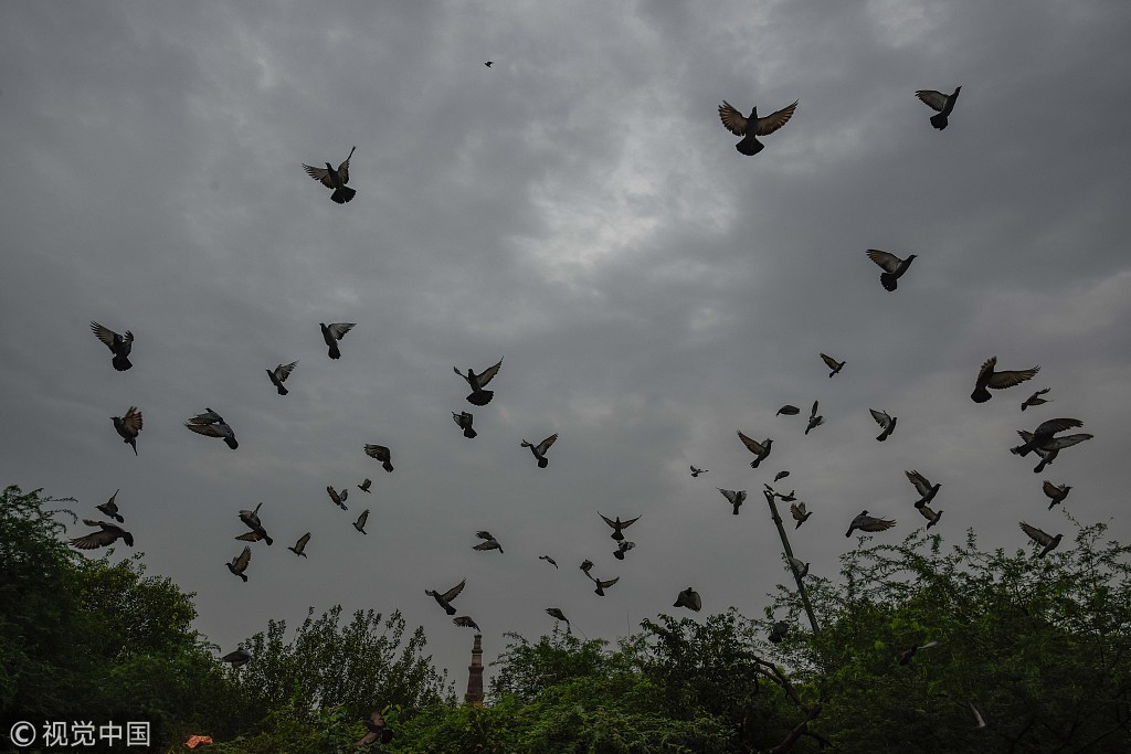 印度新德里乌云密布电闪雷鸣 民众享受大雨前凉爽天气