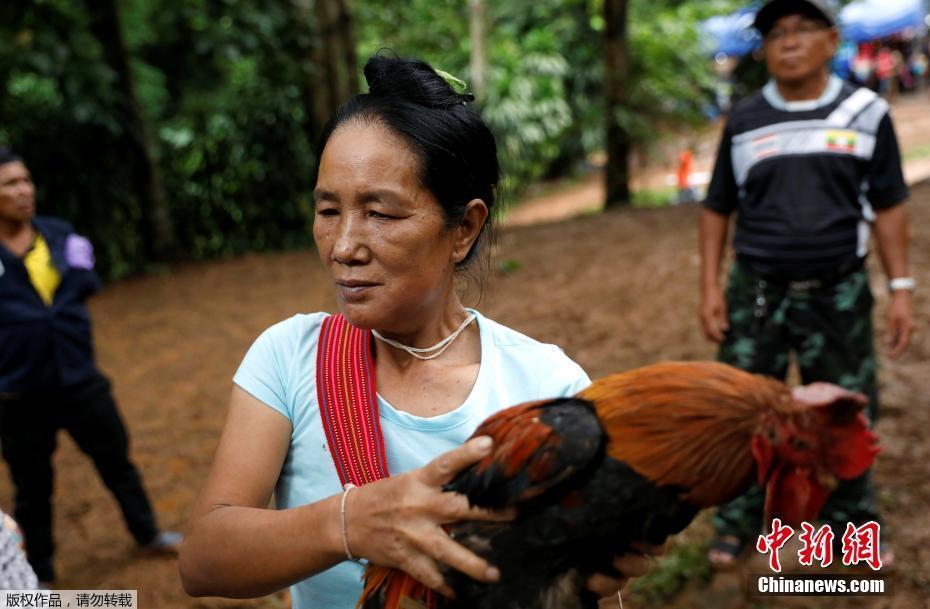 据悉,平常每个周末,足球队员们都会到Pong Pha运动场训练,23日当天中午12:00训练完后,教练和队员全部一起前往Tham Luang洞游玩,但之后洞穴管理员却未见他们出洞。截至目前,这支足球队的13名成员已经失联5天。图为清莱民众放生公鸡,为失联者祈福。