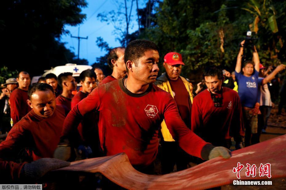 曼谷市政府27日派出大批人力物资支持清菜府洞穴搜救工作,派送排水系统工作人员、水管和抽水机到现场援助。图为救援人员正在准备水管,进行抽水。