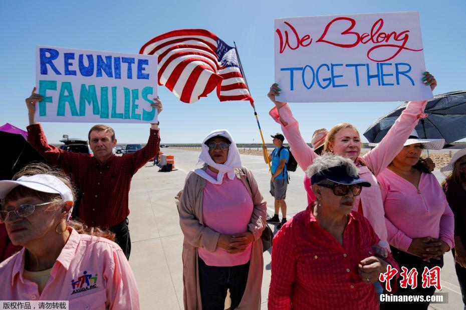 在美国与墨西哥边境的儿童被迫与父母分离的消息曝光后,美国社会各界都呼吁特朗普政府采取措施,制止这种不人道的行为。图为“帐篷城”外抗议的民众。