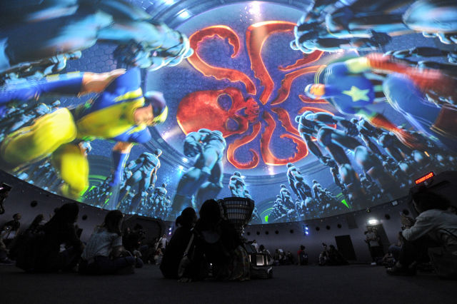 6月27日,游客在观看“4D立体投影”穹幕影片。