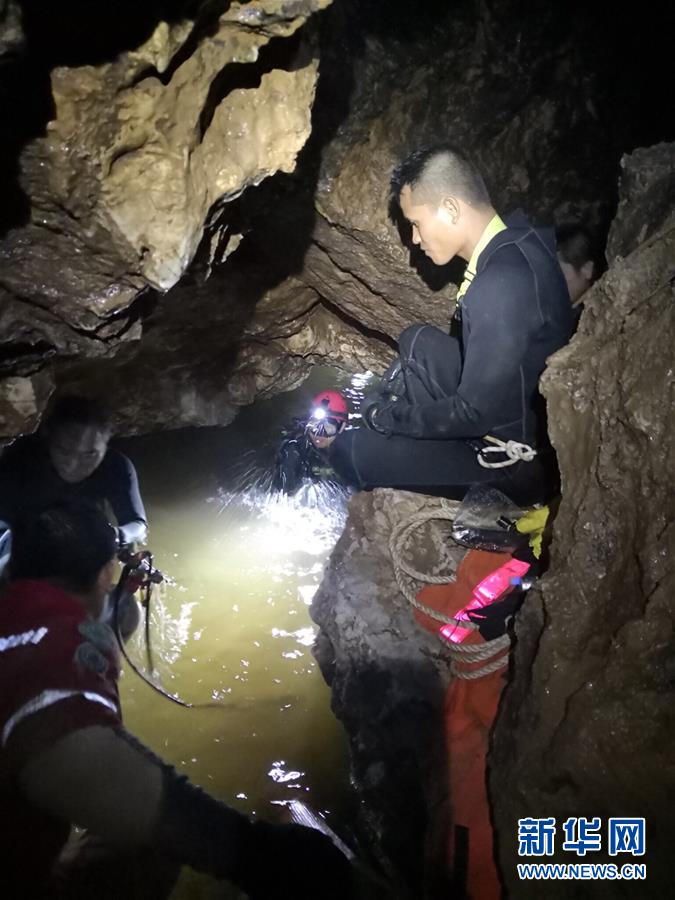 7月3日,在泰国清莱,中国北京平澜公益基金会洞穴救援专家潜入洞穴为救出被困人员做准备。泰国12名少年足球运动员和1名教练6月23日进入泰国一处国家公园洞穴内“探险”后失踪。连日来,泰国、美国等国的多支救援队展开昼夜搜救行动。中国洞穴救援专家队6月29日抵达泰国,加入对13名失踪泰国少年足球队成员的搜救行动。新华社发