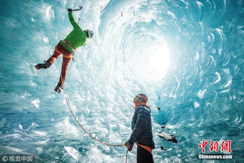 2018年1月23日消息(具体拍摄时间不详),对于长满植物的绿色天坑人们也许并不陌生,但湛蓝晶莹的冰穴则一定少有人见过。近日,在法国小镇夏蒙尼,摄影师Mathis Dumas与登山勇士杰夫·梅西艾就在一个圆柱形的冰洞里进行了一次不可思议的旅行。他们深入当地冰川的巨大洞穴中,拍下一组唯美壮观的照片,令人大饱眼福。 图片来源:视觉中国