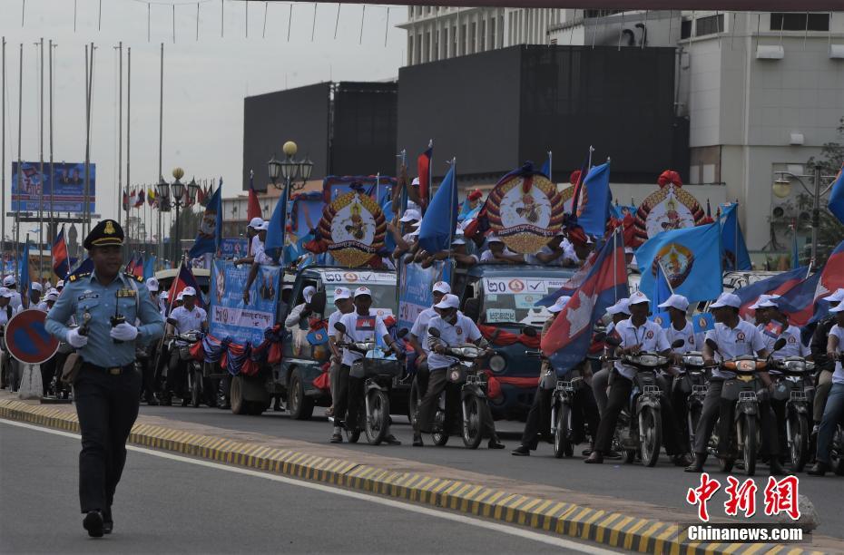 7月7日,柬埔寨第六届全国大选竞选宣传拉票拉开序幕,参加本届大选20个政党中的人民党、奉辛比克党和民主联盟党等多党组织数万选民在金边上街“造势”。 中新社记者 黄耀辉 摄