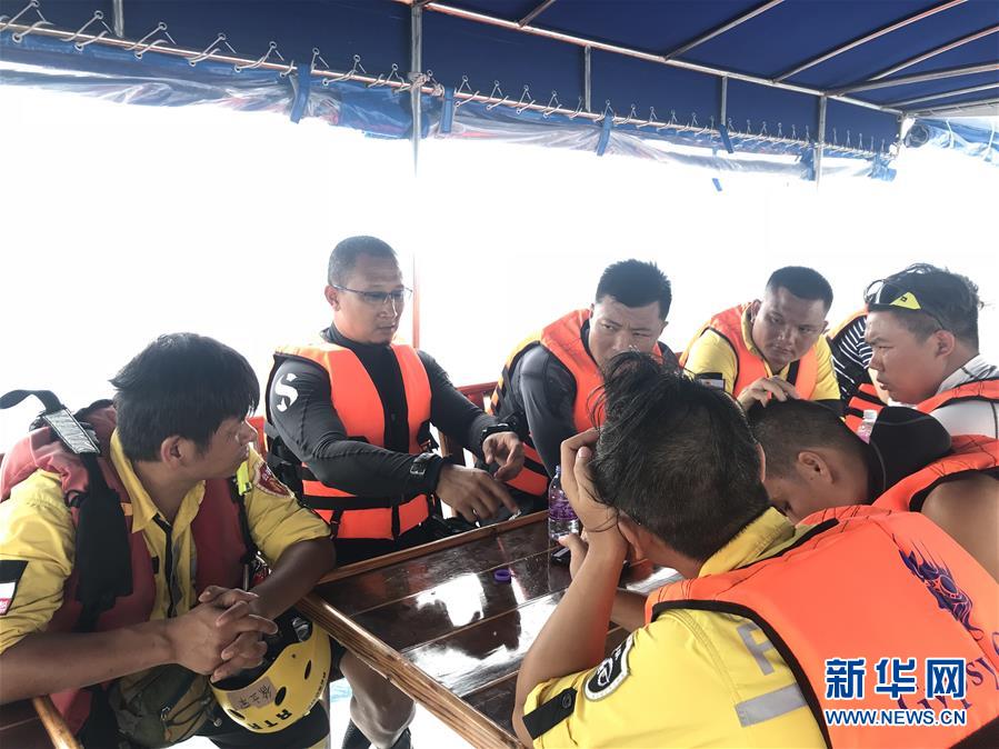 7月8日,在泰国普吉,来自民间的公羊救援队与普吉蓝海救援队成员制定救援方案。