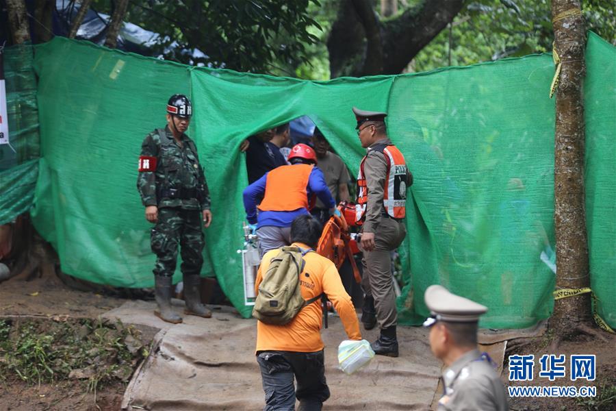 7月8日,在泰国清莱,救援人员在少年足球队被困洞穴附近工作。新华社发