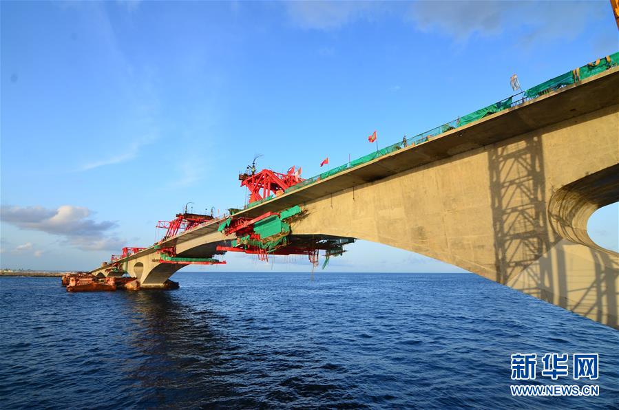 7月9日,位于马尔代夫的中马友谊大桥主桥合龙贯通。随着中国在马尔代夫援建的中马友谊大桥主桥20号墩至21号墩之间的钢箱梁9日成功合龙,大桥至此全线贯通,建设工作取得关键性进展。新华社发(杜才良摄)